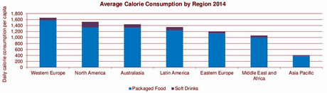 Come si evince dalla tabella riportata qui sopra, Europa Occidentale e Nord America sono poi, senza ombra di dubbio, i Paesi dove si mangia di più e dove, quindi, l'introito calorico è maggiore.