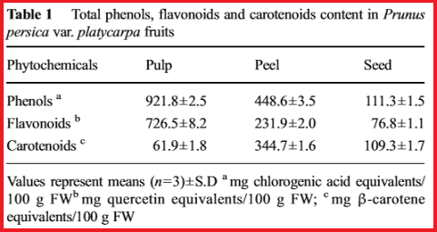 Fonte: Monica R. Loizzo, Deborah Pacetti, Paolo Lucci, Oscar Núñez, Francesco Menichini, Natale Giuseppe Frega, Rosa Tundis, ‘Prunus persica var. platycarpa (Tabacchiera Peach): bioactive compounds and antioxidant activity of pulp, peel and seed ethanolic extracts’, 2015, Plant Foods for Human Nutrition, DOI 10.1007/s11130-015-0498-1