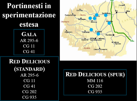 Per quanto riguarda la scelta del portainnesto, Nari dice: "Dipende dal gruppo varietale, dalla fertilità e caratteristiche del terreno, dalle condizioni idriche e dall'eventuale reimpianto. In questo momento diversi cloni di M9 sono utilizzati come portainnesto del gruppo Gala, Red Delicious, Fuji, Braeburn, Golden".