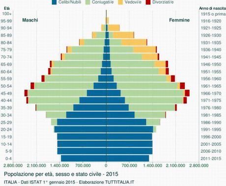 La "piramide demografica" rovesciata italiana. Clicca qui per un ingrandimento.