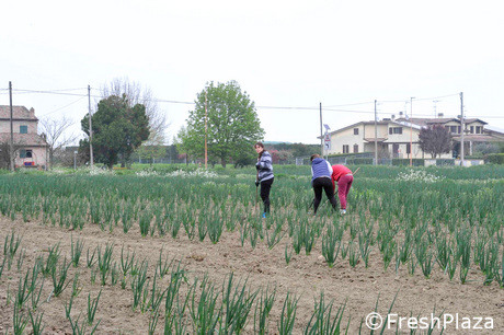 Altra verifica in campo ha riguardato il Bunching Onion, altrimenti chiamato cipollotto. Questo è destinato alla produzione di seme che è stato richiesto da un cliente statunitense. Nel momento della verifica in campo, tre operaie (rumene) stavano rompendo la crosta superficiale del terreno per favorire la penetrazione dell'acqua e togliere eventuali infestanti. "Non è per niente facile coltivare il Bunching Onion da seme – spiega Bacchi – e non a caso siamo in pochi a farlo. Ottenere un elevato grado di germinabilità è impresa ardua ma, grazie a una tecnica particolare, l'anno scorso ci siamo riusciti e per questo il cliente ci ha confermato il contratto".
