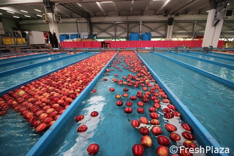 Una fase di lavorazione delle mele, nello stabilimento di Ferrara (FE).