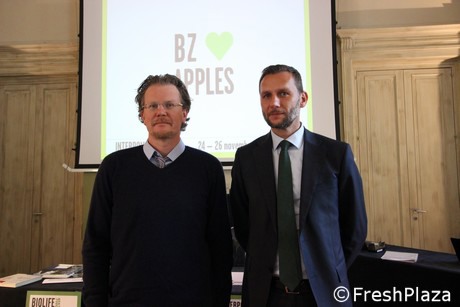 A sinistra Walter Guerra, responsabile Frutticoltura al Laimburg; a destra Thomas Mur, direttore di Fiera Bolzano, durante la presentazione dell'edizione 2016 di Interpoma.