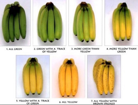Per lo studio, i ricercatori hanno considerato sei stadi di maturazione (stadio 2= banana verde; stadio 3= banana verde con un po' di colore giallo; stadio 4= banana gialla con un po' di verde; stadio 5= banana gialla con lieve colorazione verde solo alle estremità; stadio 6= banana 100% gialla; stadio 7= banana gialla con qualche macchia scura).