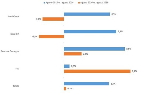 La variazione delle vendite di prodotti di IV gamma nei periodi agosto 2014-agosto 2015 e agosto 2015-agosto 2016 in base all'area geografica. Clicca qui per consultare il grafico a dimensioni maggiori. (Grafico rielaborazione FreshPlaza su dati Ismea-Nielsen presentati da SG Marketing)