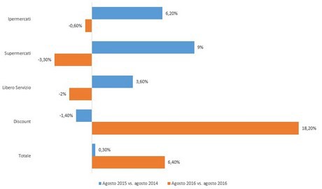 La variazione delle vendite dei prodotti di IV gamma nei periodi agosto 2014-agosto 2015 e agosto 2015-agosto 2016, in base al canale di vendita. Clicca qui per consultare il grafico a dimensioni maggiori. (Grafico rielaborazione FreshPlaza su dati Ismea-Nielsen presentati da SG Marketing)