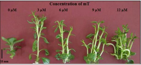 Mentre un buon tasso di moltiplicazione e un'alta qualità dei germogli sono stati rilevati sulle piantine cresciute utilizzando 6 e 9 micromoli di mT, che ha migliorato lo scambio gassoso a livello fogliare.