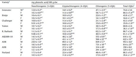 Contenuto di acidi clorogenici nelle diverse varietà di patata (W= patata intera; F= polpa).