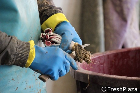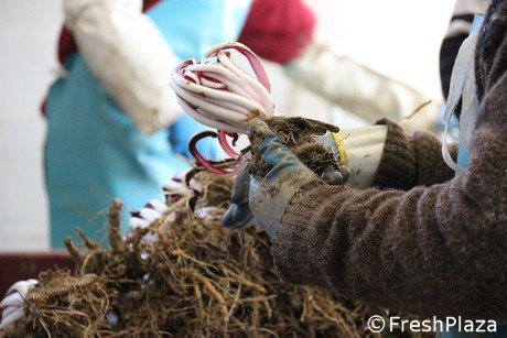 La fase di pulizia dei radicchi. Di quanto raccolto inizialmente si arriva a togliere fino al 70%.