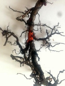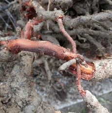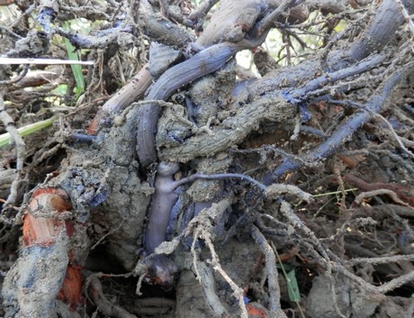 Radici in condizioni di asfissia. Il colore viola è sintomo di mancanza di ossigeno.