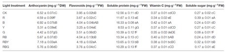 Effetto delle condizioni di luce su antocianine, flavnoidi, proteine solubili, vitamina C e zuccheri solubili in piantine di cavolo viola. (CK=luce bianca, controllo; R= luce rossa; B= luce blu; Y= luce gialla, G= luce verde)