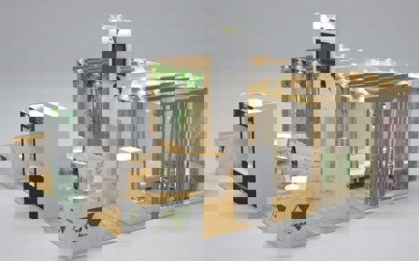 Sopra e sotto: rendering degli stand a Fruit Logistica 2017, progettati dalla Piuomenoassociati.