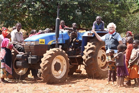 Patrizio Roversi insieme ai bambini del villaggio con il trattore donato da New Holland