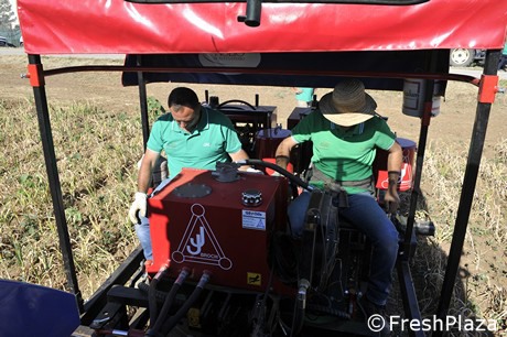 Sulla macchina vi sono due operatori che controllano che tutto proceda bene, soprattutto che gli organi che sollevano l'aglio siano sempre in linea, sulla fila. In caso contrario, avvertono chi si trova sulla trattrice. Questa è dotata di due ruote molto strette, per potersi inserire fra le file di aglio senza calpestarlo.