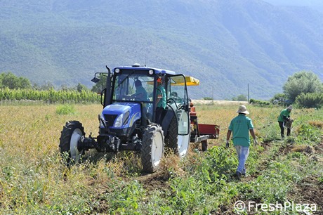 L'aglio in mazzi viene ripulito a mano dalla terra rimasta nelle radici e poi caricato.