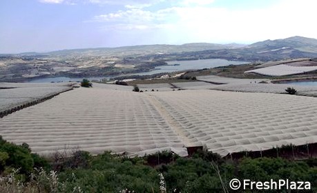 Nella foto: i tendoni di uva da tavola Goden Grapes. Sullo sfondo, la Diga S. Giovanni - Naro (Ag).