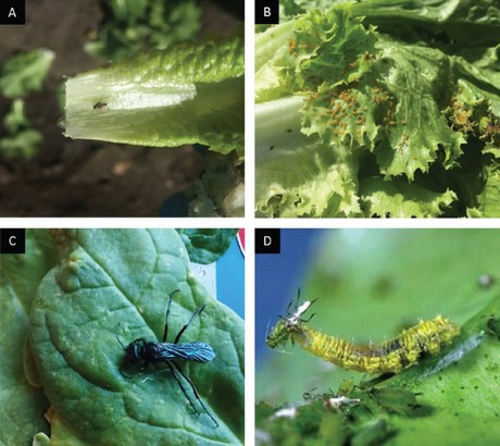 I potenziali insetti vivi o morti sui prodotti raccolti possono ridurre la qualità: (A) mosca, (B) afide, (C) vespa, e (D) larva di sirfide. Anche se gli insetti utili (C e D) predano gli insetti dannosi, la loro presenza al momento della raccolta può comportare che il raccolto venga declassato. (Foto A-C di Shimat V. Joseph e foto D di Jack K. Clark)