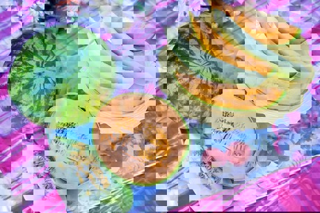 Fino al 26 luglio, si "risparmia anche in vacanza" nel volantino Simply Sma (Cityper e IperSimply): i meloni retati (di provenienza non espressa) sono offerti a 0,99 euro/kg.