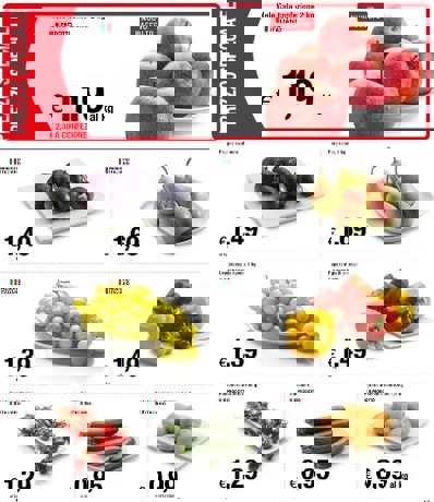 Fino al 10 settembre 2017, Iper La grande i ha in offerta: mele Gala italiane del nuovo raccolto in confezione da 2 kg a 1,19 euro/kg; prugne ovali nere, coltivate in Italia, a 1,49 euro/kg; pere Coscia italiane a 1,69 euro/kg; uva bianca italiano in confezione da 500 g a 1,19 euro; radicchio rosso tondo italiana a 1,39 euro/kg; peperoni italiani gialli o rossi a 1,49 euro/kg; pomodoro datterino italiano, in confezione da 500 g, a 1,29 euro; zucchine italiane a 0,95 euro/kg; patate al selenio, coltivate in Italia, in confezione da 1,5 kg a 0,99 euro/kg.
