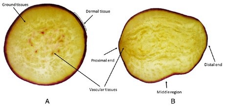 Sezione trasversale (A) e longitudinale (B) di una fetta di patata dolce.