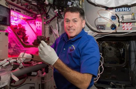 L'astronauta Shane Kimbrough sta raccogliendo la lattuga romana rossa (cv. Outredgeous) coltivata nella camera di crescita Veggie sulla stazione spaziale internazionale.