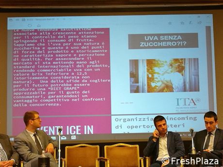 Sul lato sx della slide dell'ICE si legge come le tendenze salutistiche stiano imponendo un consumo di frutta ipocalorica. Si pensa già a un'uva "diet".