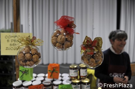 Davvero originale l'idea dell'azienda "Osti Marco", certificata bio da ormai 30 anni. Avendo uno scarsissimo raccolto di noci per via del gelo primaverile, i titolari hanno pensato di mettere le poche noci raccolte in sfere trasparenti con nastrino rosso, così da realizzare delle decorazioni natalizie. Un modo intelligente per valorizzare al meglio una produzione quantitativamente scarsa.