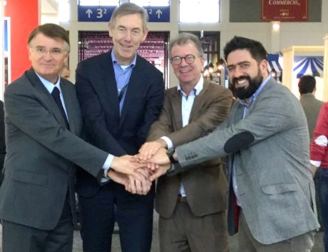 Da sinistra Renzo Piraccini presidente Macfrut, Ton Otten direttore Vnu Exhibition, Niek Reichelt Vnu Exhibition, Raul Calleja direttore Fruit Attraction