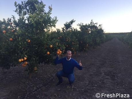 Alessandro Barbera amministratore unico della siciliana Barbera International. Sullo sfondo, 10 mila piante di Tarocco Rosso biologico che entreranno in produzione nella stagione agrumicola 2018-2019.
