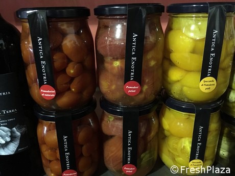 Completano la linea i pomodori pelati e i pomodorini al naturale, lavorati artigianalmente e conservati in acqua e sale a poche ore dalla raccolta; oltre ai pomodori secchi che, disidratati al sole, racchiudono in sé un incomparabile sapore. Ideali per farne un gustoso contorno e antipasto grazie alle proprietà conservanti dell'aceto e del nostro olio extravergine di oliva".