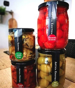 Completano la linea i pomodori pelati e i pomodorini al naturale, lavorati artigianalmente e conservati in acqua e sale a poche ore dalla raccolta; oltre ai pomodori secchi che, disidratati al sole, racchiudono in sé un incomparabile sapore. Ideali per farne un gustoso contorno e antipasto grazie alle proprietà conservanti dell'aceto e del nostro olio extravergine di oliva".