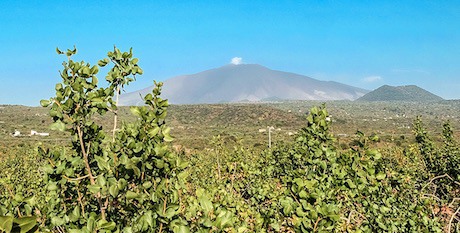 Sullo sfondo dell'Etna, vista panoramica dei pistacchieti dell'azienda Caudullo Srl.