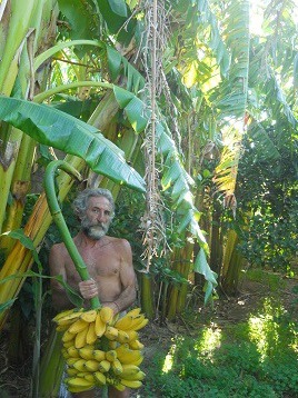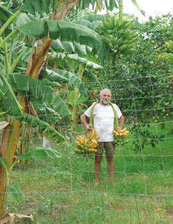 "Come si coltiva il banano? questo richiederebbe un trattatello, ma in estrema sintesi posso dire che spiantiamo dalle piante madri i polloni di età e misura adatta e li trapiantiamo in buche concimate con letame maturo; irrighiamo, se necessario, ogni settimana, ma con volumi idrici molto bassi (20/30 litri a pianta); aspettiamo la quasi maturazione dei caschi; raccogliamo alla prima invaiatura, cioè ai primi accenni di viraggio del colore dell'epicarpo nel caso di merce con destinazioni più lontane; mentre a uno stadio leggermente più avanzato per il consumo locale; poi tagliamo quasi a zero la pianta che ha già prodotto".