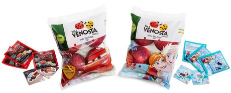 Infine, per i più piccoli le coccinelle di Mela Val Venosta hanno trovato nuovi amici tra i personaggi Disney di Cars3 e Frozen. Dal co-branding con Disney Italia nasce una novità disponibile sul punto vendita da metà febbraio in cui Mela Val Venosta ha unito il divertimento a due varietà, Pinova e Gala: all'interno dei flow pack Disney-Val Venosta 4 mele di calibro piccolo, si troveranno 2 stickers dei personaggi di Cars3 e Frozen tutti collezionabili sul poster scaricabile dal nuovo sito www.vip.coop/Disney.