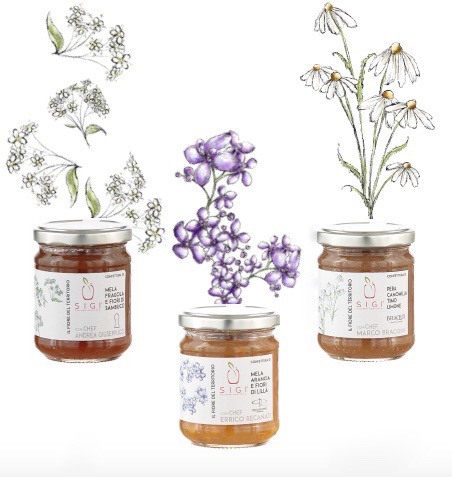 Da questa collaborazione sono nate tre speciali confetture, con tre fiori come protagonisti: