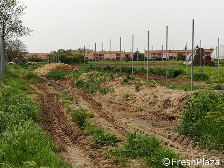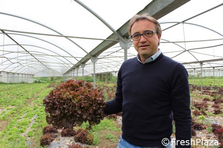 L'imprenditore mostra, fiero, il terreno, su cui è distribuito il compost biodinamico, pre semina o trapianto.