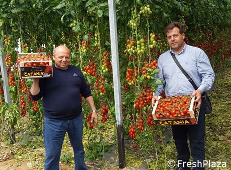 Giovanni e Giuseppe, con il loro pomodoro Piccadilly nella cassetta a marchio F.lli Catania