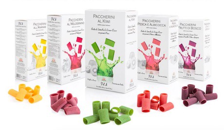 Paccherini di semola di grano duro a marchio Rustichella d'Abruzzo nei gusti di melograno, kiwi, ananas, pesca e albicocca.