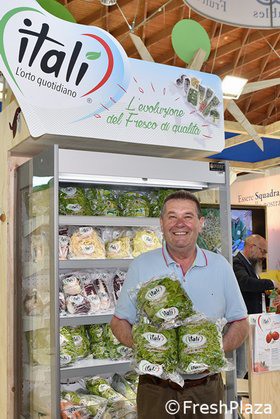 Paolo Comparini del Consorzio Italì (controllata di OPO Veneto), insieme al presidente di OPO Veneto Adriano Daminato presentano il packaging biocompostabile in PLA, per insalate e ortaggi di I gamma evoluta.