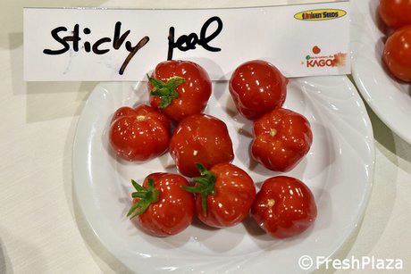 Ma le sorprese non finiscono qui: accanto a pomodori tradizionali, dalla buccia consistente, ci sono quelli con un carattere genetico cosiddetto "sticky peel", cioè con una superficie senza una vera cuticola superiore, cosa che rende il pomodoro insolitamente lucido, quasi gelatinoso, molto delicato alla manipolazione ma sorprendente.