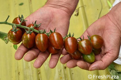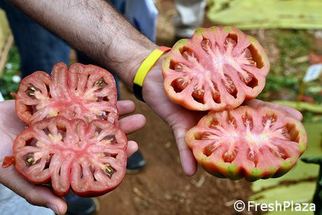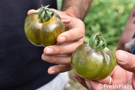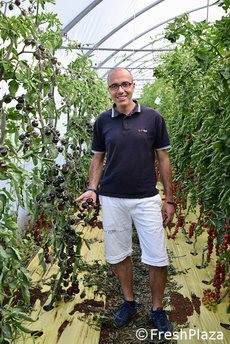 Il breeder Giuseppe Manilia con una delle sue creazioni, qui il pomodoro nero.
