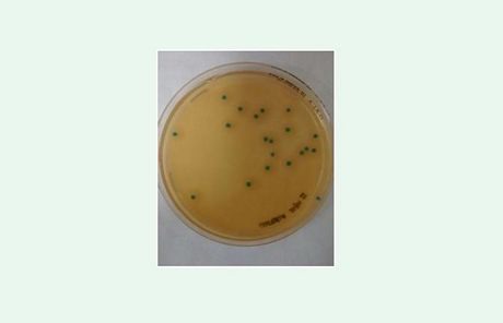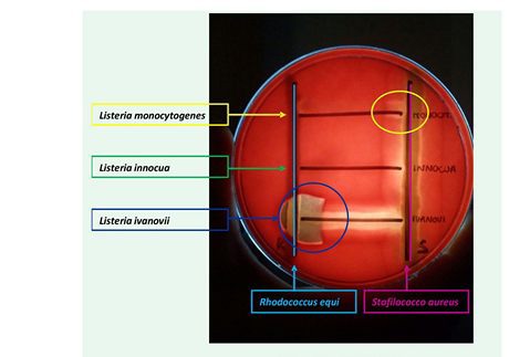 Sopra: la Listeria monocytogenes cresce sul terreno di coltura ALOA sotto forma di colonie verdi circondate da un alone opaco