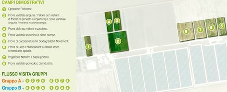 I campi dimostrativi oggetto delle visite: Operation pollinator, Prova varietale anguria/melone, Prova oidio su melone e zucchino, Prova varietale zucchino, Prova di pacciamatura teli biodegradabili Novamont, Prova di Crop Enhancement, Irrigazione Netafim a bassa portata, Prova varietale pomodoro da industria.