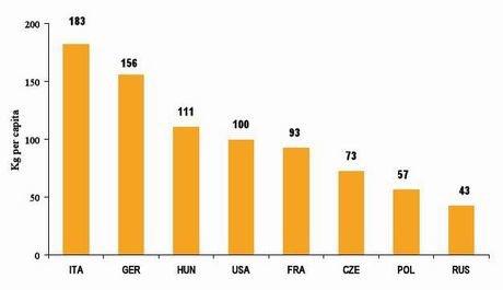 Grazie a migliorate condizioni di vita e ad un'accresciuta disponibilità di spesa, i russi consumano oggi più frutta rispetto al passato. Tuttavia la media pro capite di consumo annuo (43 kg) è ancora a livelli molto bassi rispetto alle medie registrate nei paesi sviluppati e rappresenta soltanto il 37,5% dei quantitativi minimi raccomandati.