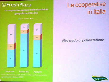 L'ortofrutta, in Italia, rappresenta un valore di 8 miliardi di euro; di questi, buona parte arriva dal mondo della cooperazione. "Se andiamo a vedere quante cooperative sono posizionate al nord, al centro e al sud d'Italia - ha continuato Mercuri - ci rendiamo conto che su un totale di 1.200 aggregazioni presenti sul territorio italiano e che gestiscono prodotti ortofrutticoli, 400 sono posizionate nelle regioni settentrionali (70% del fatturato), 120 sono localizzate al Centro (8% del fatturato), 780 cooperative si trovano al sud."