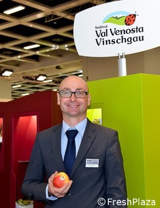 Proprio sulla Pinova, FreshPlaza ha raccolto il parere di Michael Grasser, direttore marketing di VI.P-Val Venosta, in occasione dell'ultima edizione di Fruit Logistica. Nella foto qui accanto, il direttore marketing con in mano una Pinova.