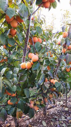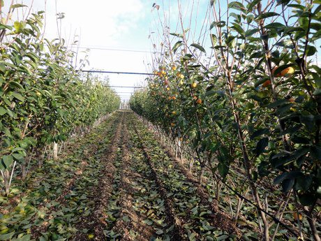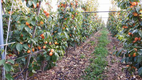 Sopra: come si presentava il frutteto di kaki a dicembre 2013, primo anno di produzione. Sotto: lo stesso frutteto a novembre 2015, terzo anno di produzione.
