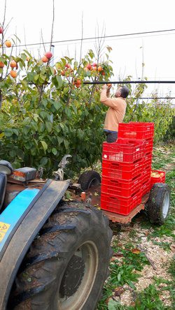 "Ho optato per una forma di allevamento a Y, con piante di altezza contenuta (inferiore ai 2,5 metri) e sesto d'impianto fitto (3 metri tra le file x 70 centimetri sulla fila). In questo modo, ho ottenuto una resa elevata, di circa 18-20 kg a pianta, al contempo rendendo agevole l'operazione di raccolta. Il 90% dei frutti - di varietà spagnola Rojo Brillante - è stato raccolto direttamente da terra mentre il 10% con l'aiuto di un piccolo carrello posto dietro il trattore".