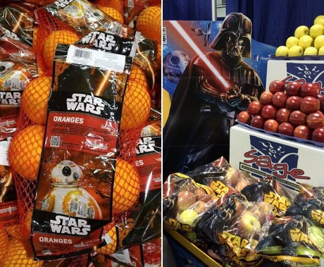 Tazze, magliette, pupazzi e così via... e con l'uscita del VII episodio "Il risveglio della Forza" l'asticella si è alzata di un'altra tacca, perché ora anche la frutta viene promossa da Star Wars. Così, sugli scaffali della grande distribuzione estera si possono trovare confezioni di uva da tavola con il volto (verde) di Yoda, il maestro Jedi che allenerà Luke Skywalker; poi ancora reti di arance e sacchetti di mele con Darth Vader che maneggia una spada laser.