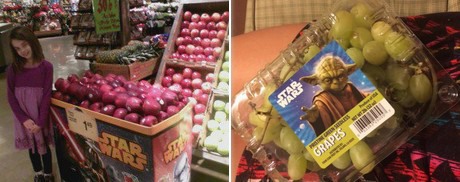 A sinistra in posa accanto alle mele di Star Wars; a destra l'uva di Yoda